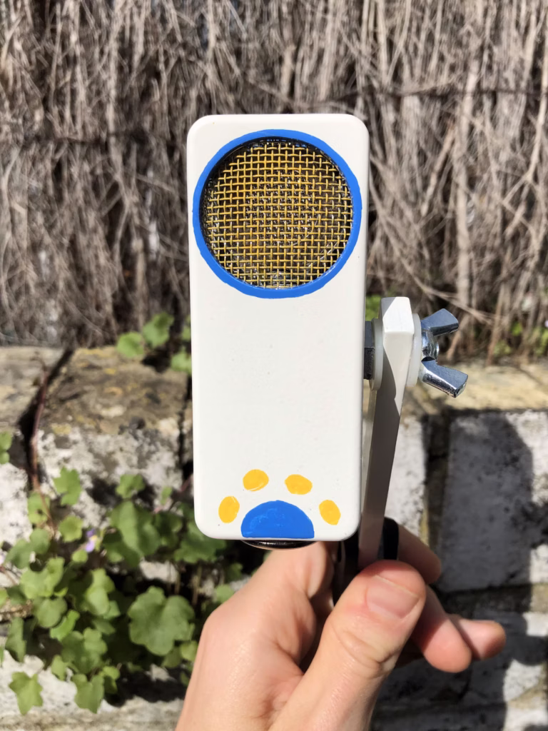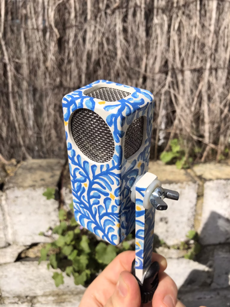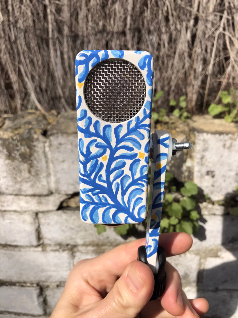In Spring 2024 I was fooling around at the Cambridge makespace building these two prototype microphones. I call them the “sardines.” Inspired by Portugese tiles and sardine-can art, my partner hand painted their designs. Inside is a JLI2555 capsule, a FET and an itty bitty little transformer. The circuit is basically a km84 without the bits to polarize the capsule, since the 2555 is an electret. The circuit is very similar to the u47s I’ve been building except that the tube is replaced by a FET. It’s my first time playing around with FETs and, wow, how convenient, no heaters! These were a fun learning exercise and I’m excited to make some more with what I’ve figured out in the process. I’m pleased with how they sound, I will definitely be making more.